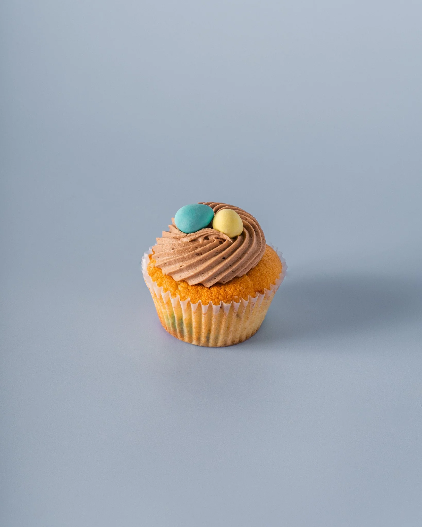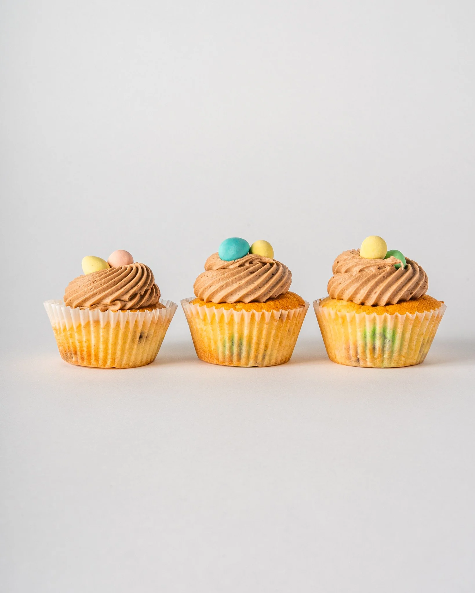 Vanilla mini egg cupcakes topped with creamy chocolate buttercream and more mini eggs!